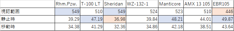 同時に視界マシマシにしたラインメタルorシェリダンで偵察した場合、どの程度の距離で発見できるのかも計算してみました。